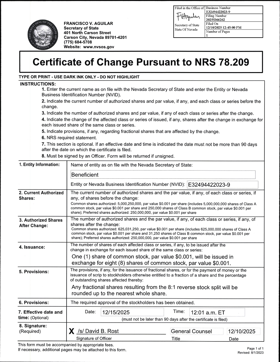 As previously disclosed, at the special meeting of stockholders of Beneficient (the “Company”) held on December 1, 2025, the Company obtained stockholder approval for a reverse stock split of the Company’s Class A common stock, par value $0.001 per share (the “Class A Common Stock”), and Class B common stock, par value $0.001 per share (the “Class B Common Stock” and together with the Class A Common Stock, the “Common Stock”) at a ratio in the range of any whole number between 1-for-5 and 1-for-100 (the “Reverse Stock Split”) and a simultaneous proportionate reduction in the authorized shares of each class of Common Stock as required by Nevada Revised Statutes Section 78.207. The Board of Directors of the Company (the “Board”) subsequently approved a Reverse Stock Split ratio of 1-for-8 to be effective December 15, 2025.
